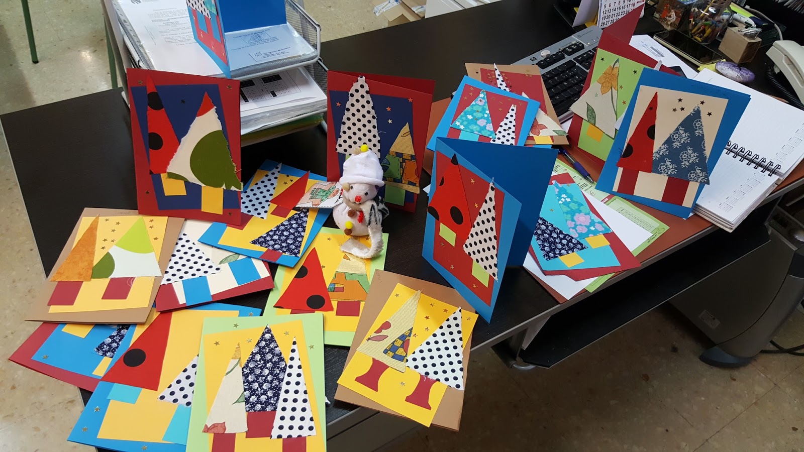 Os presentamos una muestra de nuestras postales navideñas. Hemos utilizado retales. Gracias a nuestra creatividad y a la orientación de nuestra profe Concha han salido preciosas.